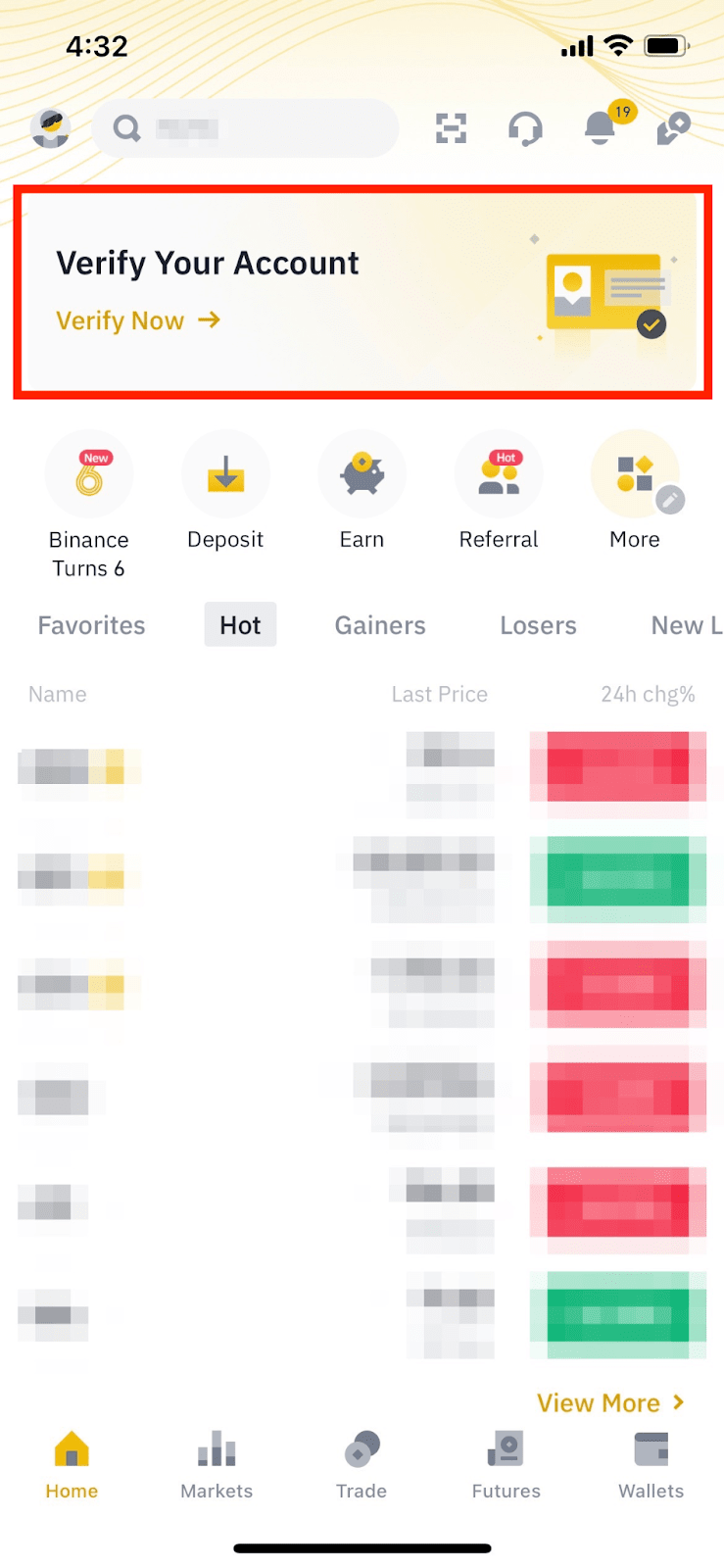1. 登录个人币安账户,然后点击 App 首页中的【立即认证】。